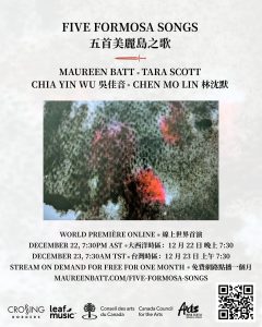Three programs have toured to Halifax, Toronto, and Philadelphia with Cheryl Duvall on piano: Crossing Borders: A Celebration of New Music from New Mexico to Nova Scotia (2015) Crossing Borders: Realities Blurred (2016) Crossing Borders: Mission Compassion (2018). Crossing Borders: Travesía Latinoamericana toured to Canada and Colombia in 2019 with Fabián Arciniegas (tenor) and Claire Harris (piano). Crossing Borders: Living Room Edition, was a livestreamed concert featuring works for solo soprano and soprano and electronics from Maureen’s living room in April 2020. Crossing Borders: Shifting the Lens featuring Tara Scott, Claire Harris, Fabián Arciniegas was a digital broadcast in December 2021. Our June 2023 digital broadcast was a première of Amy Brandon’s Vertical Labyrinth featuring Maureen Batt and the Halifax Camerata Singers. The most recent projects include world premières of Caroline’s Sweeper, a new opera by Michael Donovan, with libretto by Monica Pearce, and Five Formosa Songs, a new song cycle by Chia Yin Wu 吳佳音, with poetry by Chen Mo Lin 林沈默.