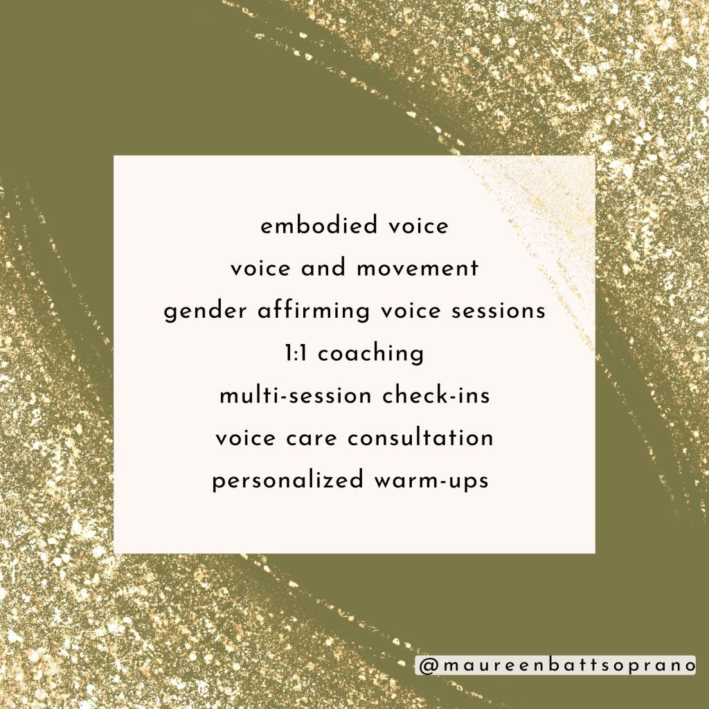 *I am not a doctor or a medical professional – meeting with me doesn’t take the place of seeing a doctor, SLP, ENT, or other vocal specialist. My hope is that our time together will give you support with new (or familiar!) angles to consider as you’re recuperating or renewing.